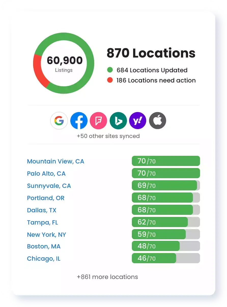 Ready to supercharge your SEO? Manage, update, and track info for thousands of locations with the ease of a single dashboard, and be found everywhere your customers search — Google, Facebook, Maps, Alexa, and beyond.